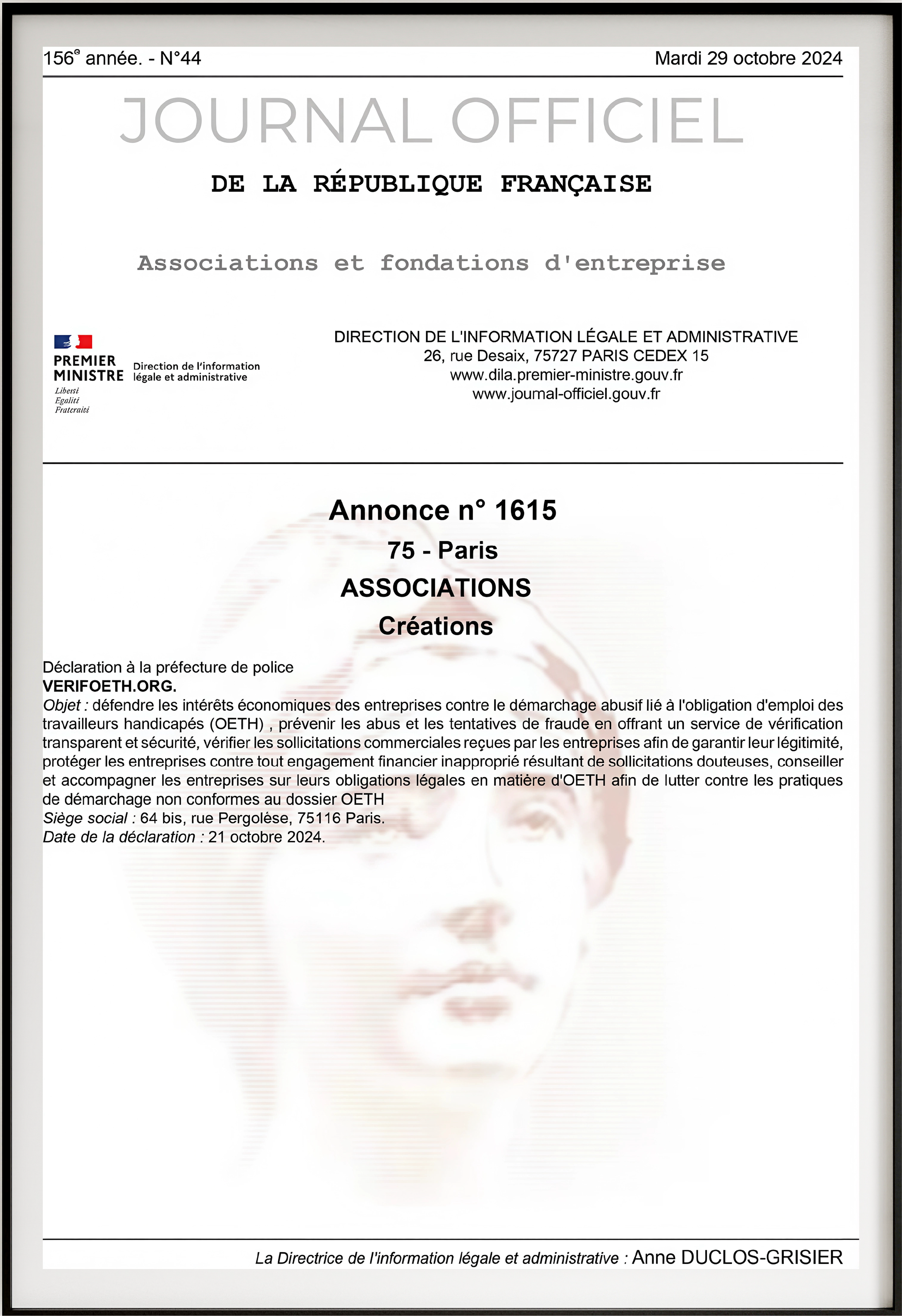 Notre mission : assurer la transparence et la sécurité des démarches liées à l’OETH”. “VerifOETH.org a été créé pour répondre à un besoin crucial des entreprises : garantir la légitimité des démarches reçues dans le cadre de la DOETH. Chaque jour, des entreprises reçoivent des sollicitations commerciales parfois frauduleuses de la part de prétendues associations mandatées d’états, d’entreprises agréées, ESAT ou TIH. Notre mission est de protéger les entreprises contre ces pratiques, tout en renforçant leur conformité aux obligations légales.”